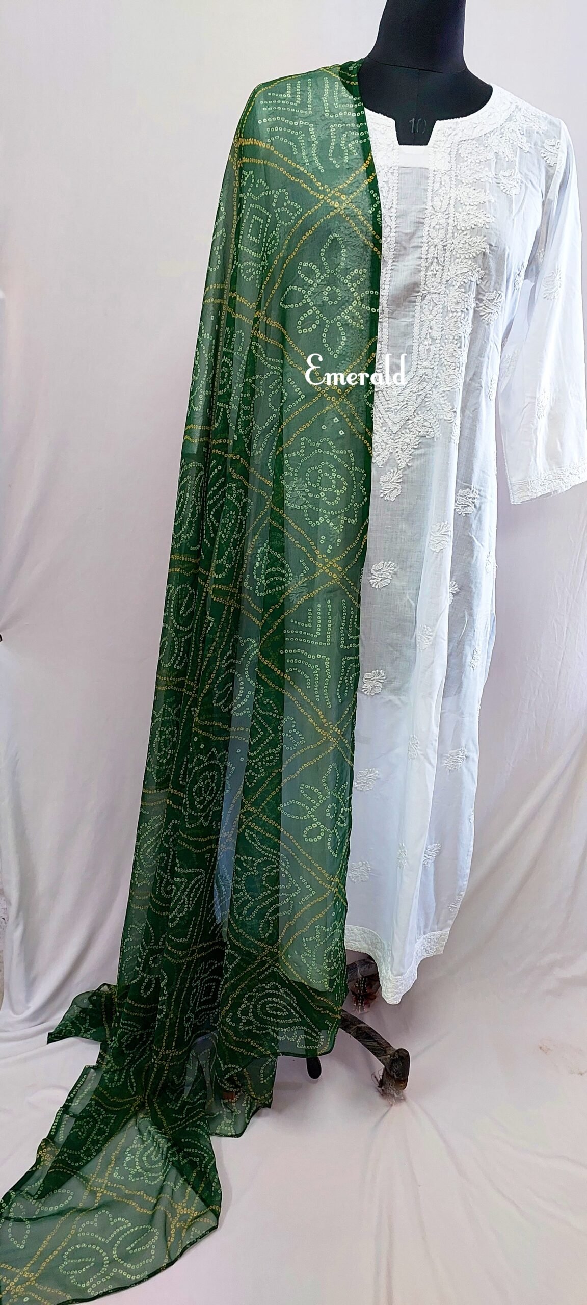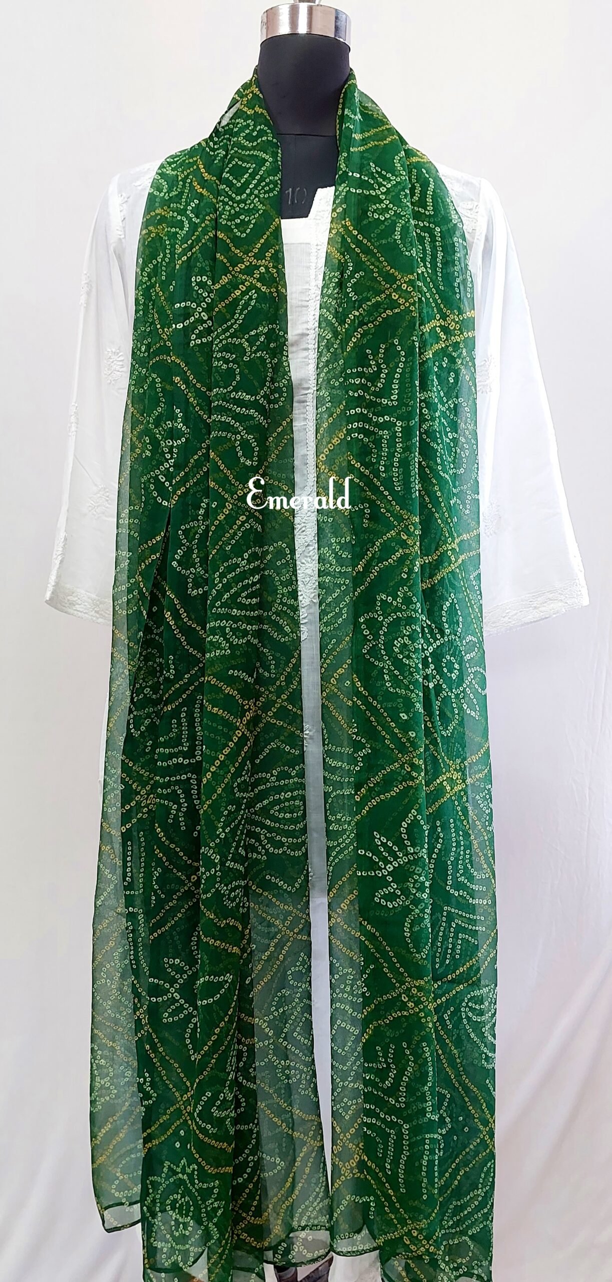 A printed green bandhani Dupatta in georgette. Eye catching colours to go well with your white kurtas or others. It’s light weight and flowy.