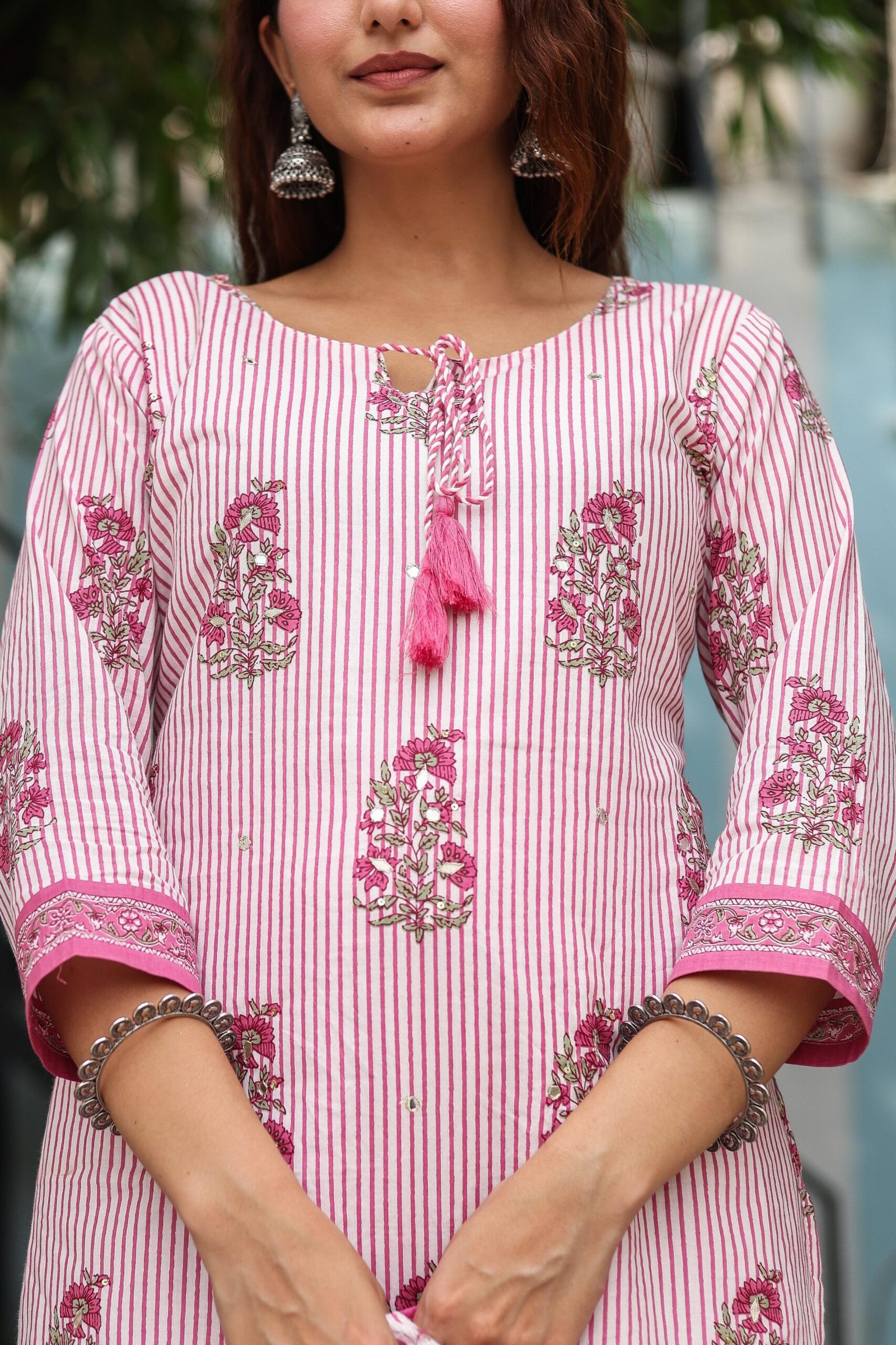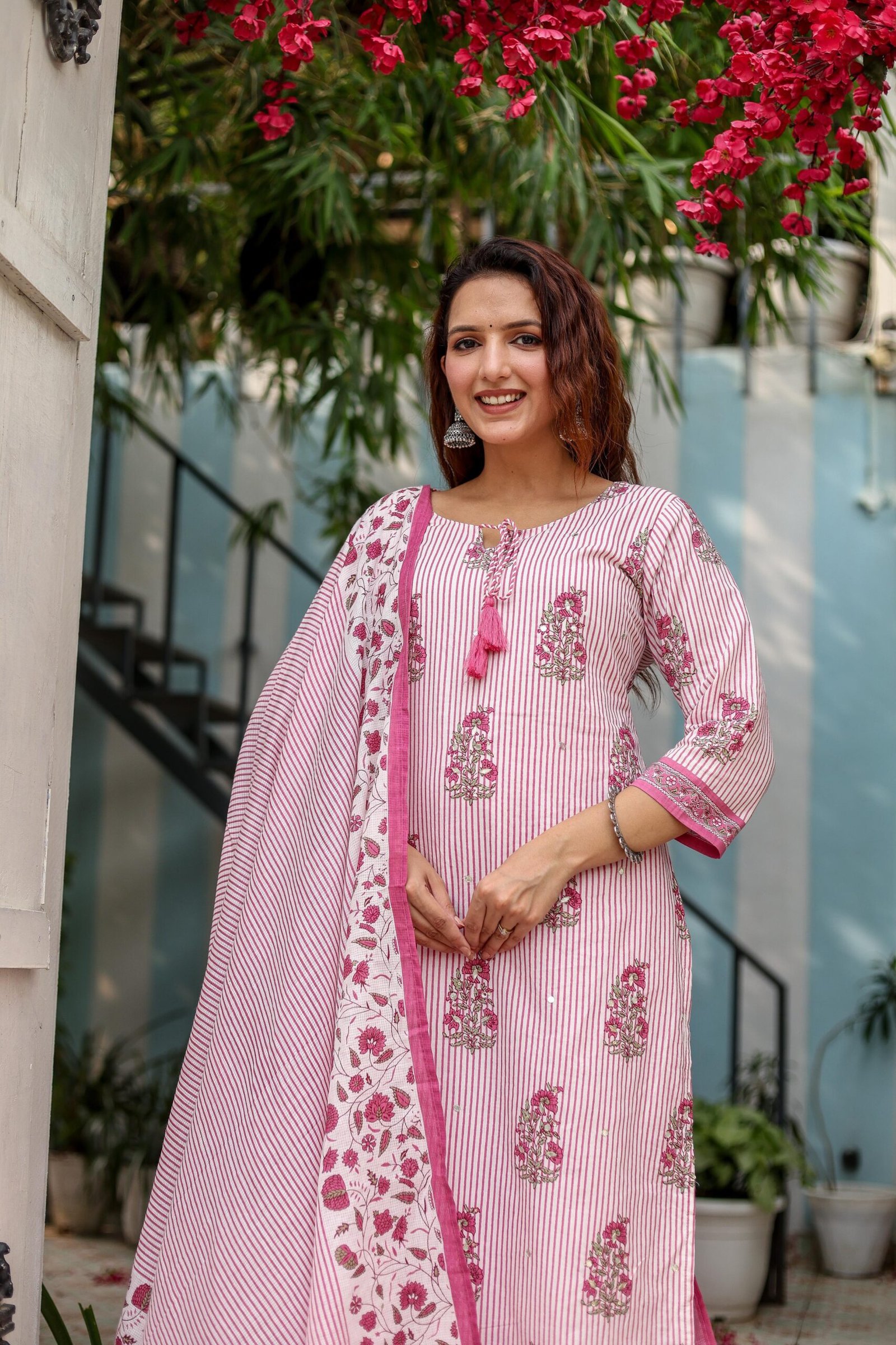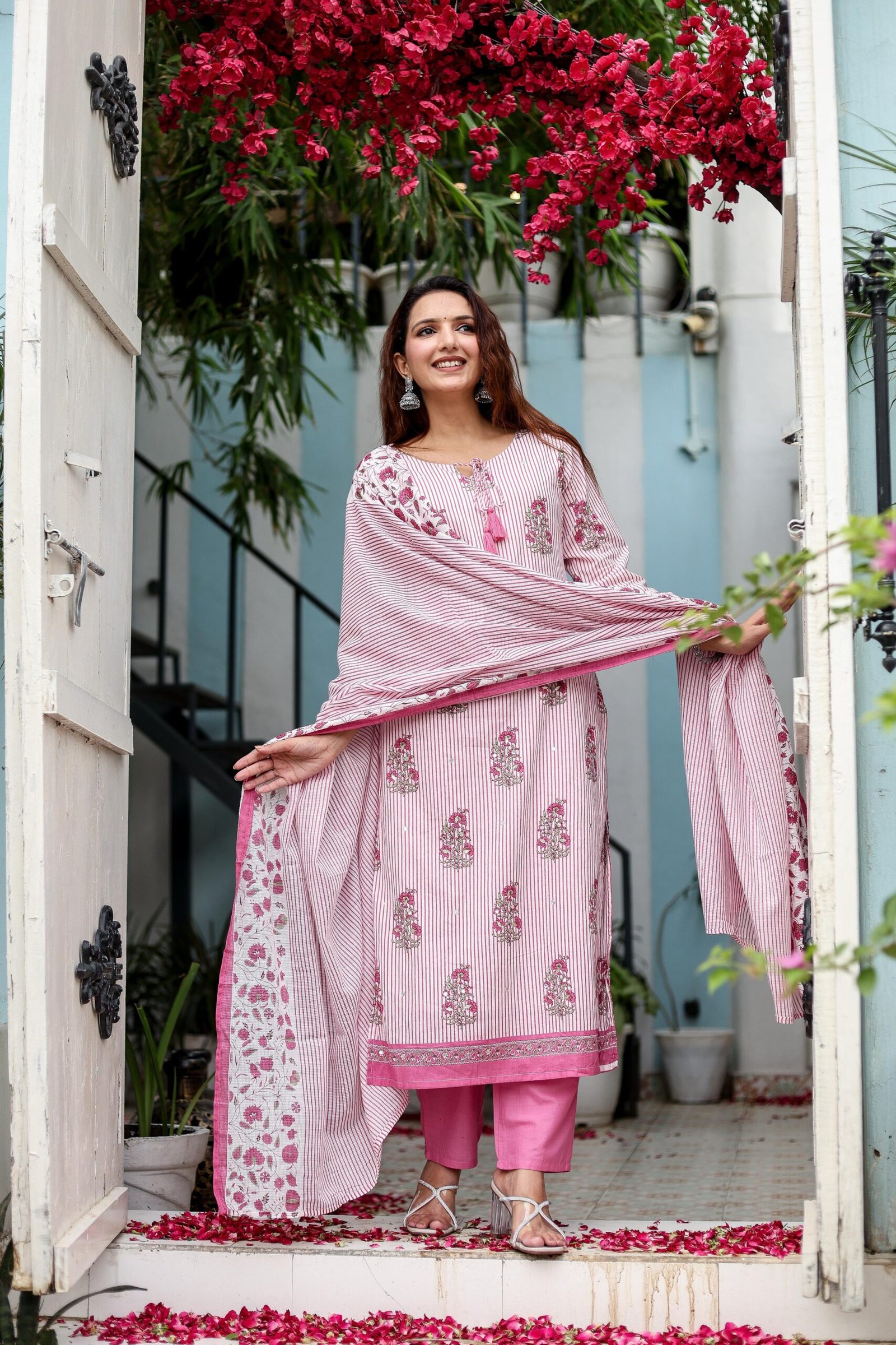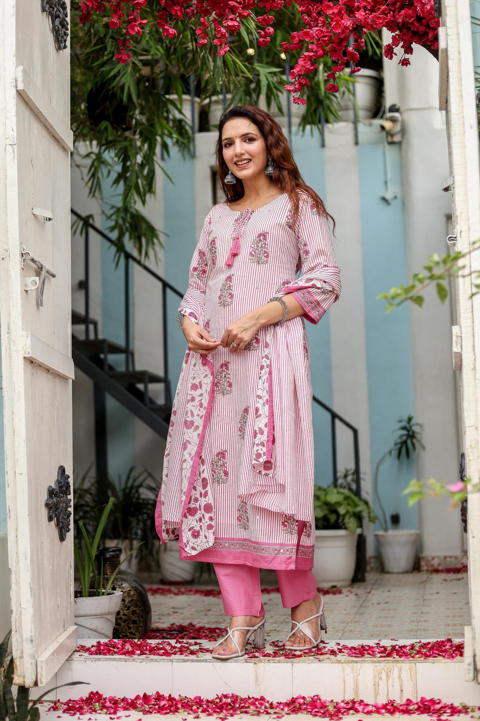 Pleasantly printed cotton kurta set in pink and white with subtle embroidery. It comes with plain pink pants and a printed dupatta.