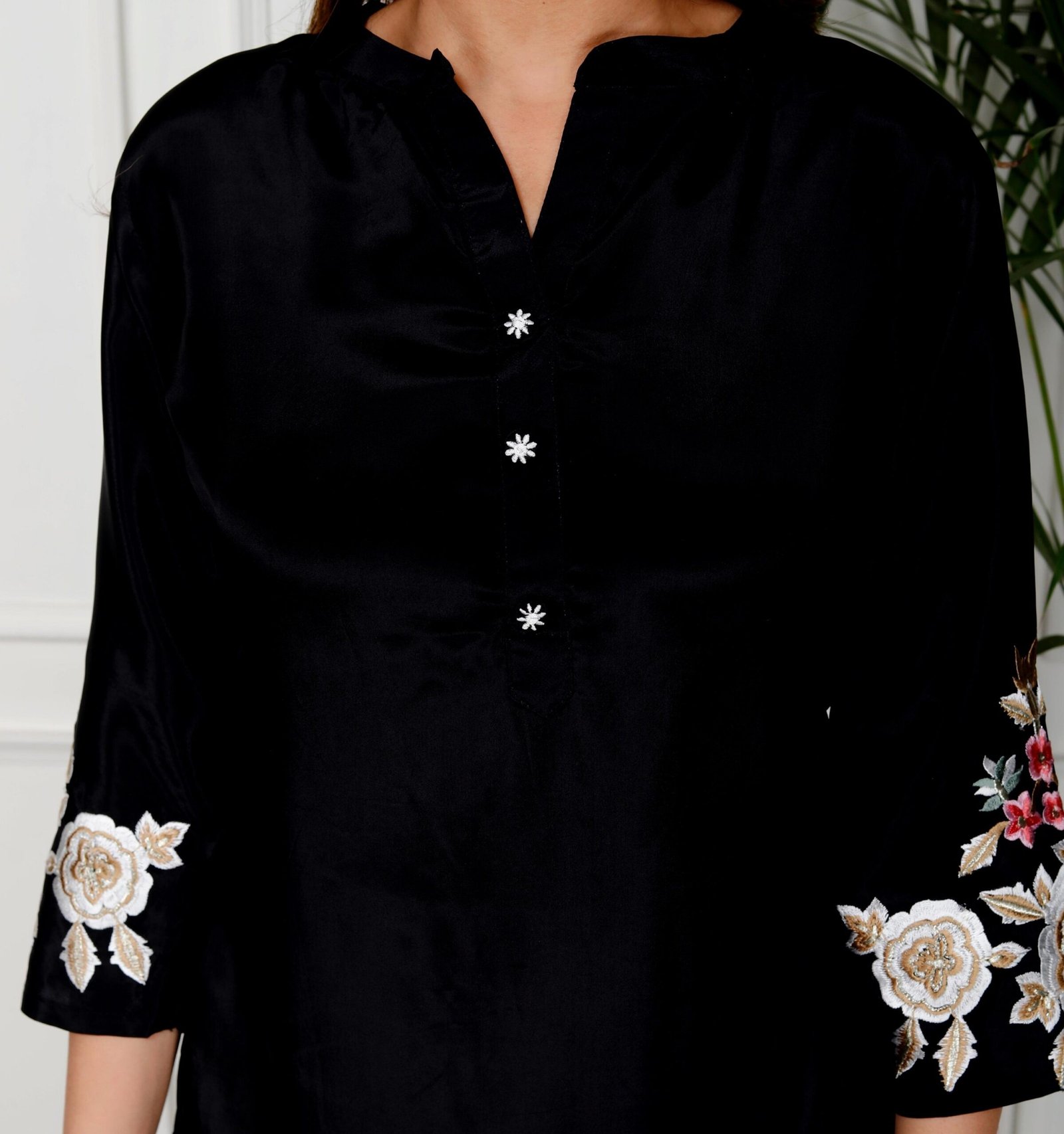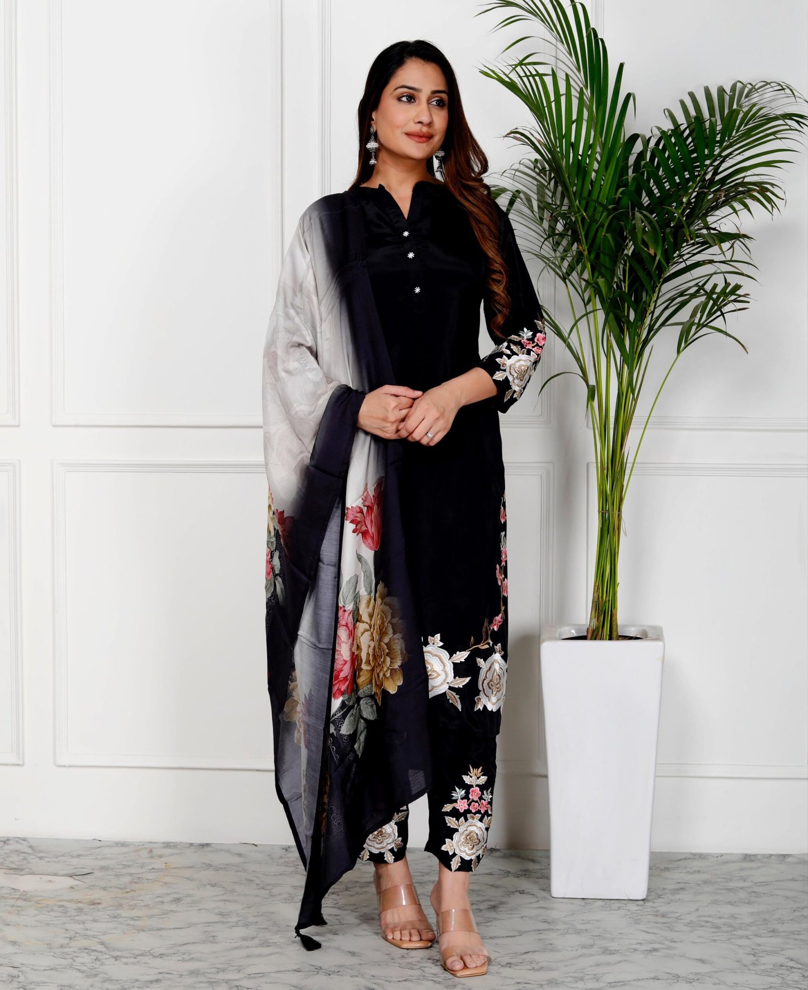 A stunning black kurta set in crepe. Boost your desi style with this trendy outfit with a pop of machine embroidered flowers and a printed dupatta.