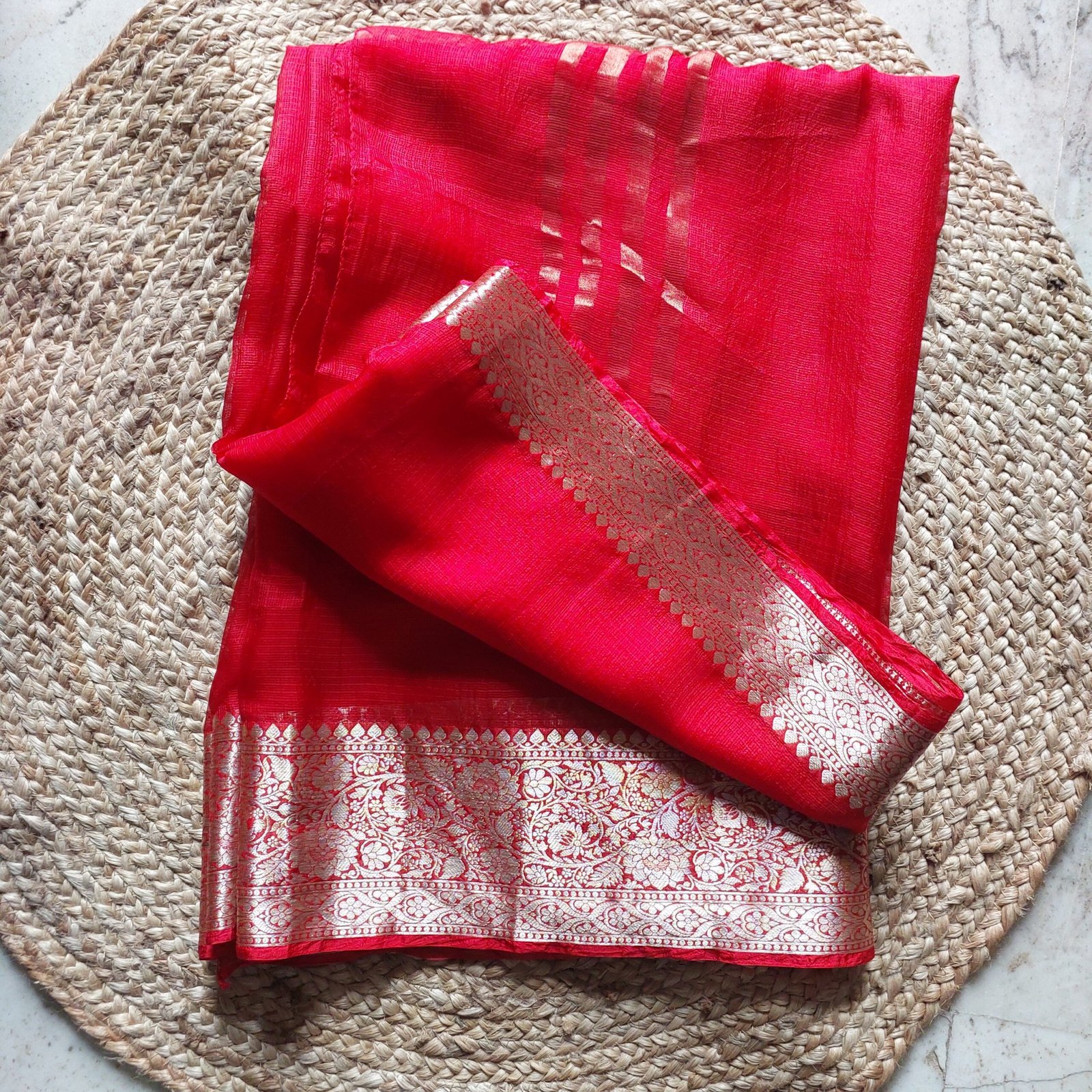 Kota Doriya Sarees are made of pure cotton or silk and have square like patterns known as khats on them. The chequered weave of a Kota sari is very popular. They are very fine weaves and weigh very little. A super light, super classy, super elegant red and gold saree in pure kota silk. Has a beautiful Banarasi border, broad on the bottom side and narrow on the top side. The saree has a self running blouse piece. This piece is perfect for the upcoming festivities. Something that you call timeless classics!